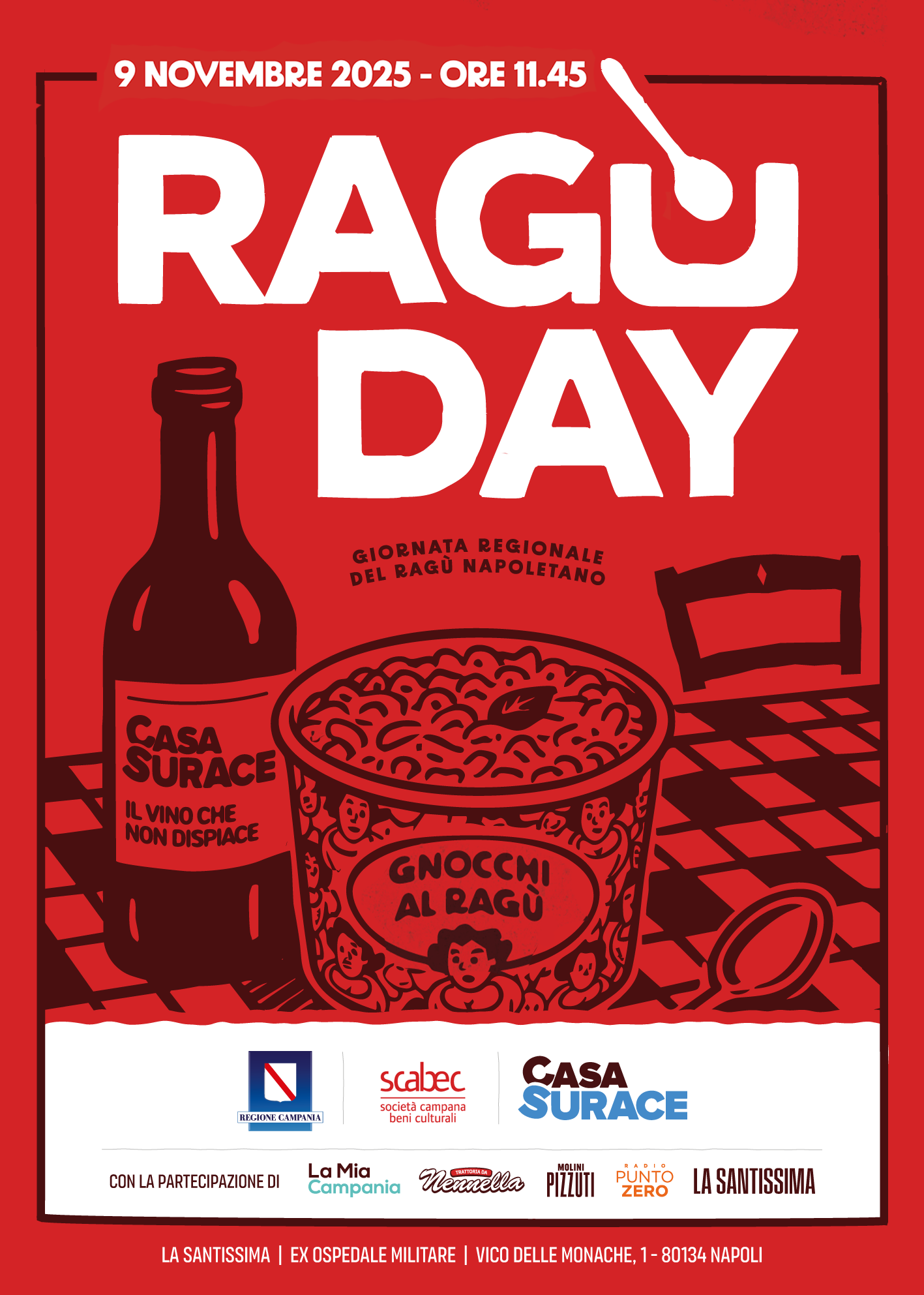 Da questo sentimento nasce il RAGÙ DAY, un evento programmato e finanziato dalla Regione Campania (L. R. 477/2025) attraverso Scabec, ideato insieme a Casa Surace per celebrare e tramandare la tradizione del ragù come simbolo di identità, affetto e appartenenza. La Giornata Regionale del Ragù Napoletano, riconosciuta ufficialmente grazie a una legge regionale promossa dal Consiglio della Regione Campania, diventa così una vera e propria festa popolare dedicata alla convivialità, alla cultura e alla memoria, con un pensiero speciale a Nonna Rosetta, la nonna di Casa Surace scomparsa quattro anni fa, dalla cui ispirazione è nata questa idea.