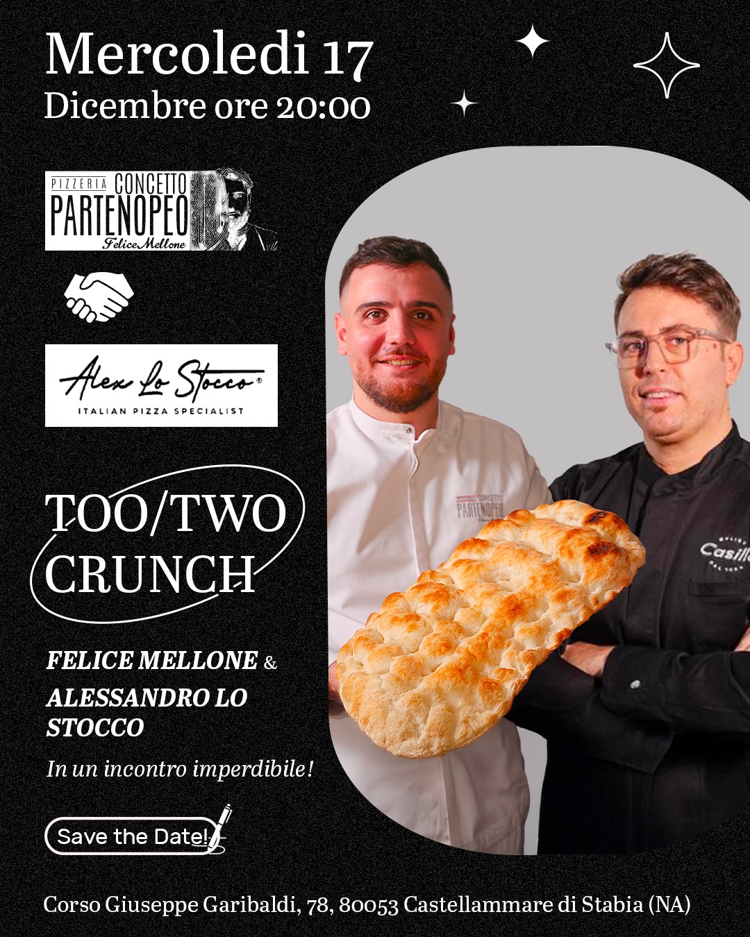 Mercoledì 17 dicembre, a partire dalle ore 20:00, presso il locale Concetto Partenopeo a Castellammare di Stabia (Corso Garibaldi 78) si terrà l’evento “Too/Two Crunch”: Felice Mellone e Alessandro lo Stocco si uniscono in un quattro mani per un’experience originale e croccante.