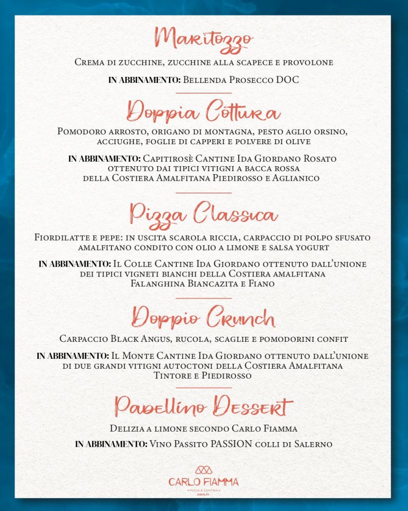 Durante l’evento, il pubblico potrà quindi toccare con mano questa sinergia, scoprendo come ogni spicchio firmato Fiamma riesca a trovare il suo equilibrio ideale tra le etichette selezionate da Ida, e non solo rendendo la teoria dell’Amodio un’esperienza gastronomica concreta e indimenticabile. In degustazione: Maritozzo con crema di zucchine alla scapece e provolone; una doppia cottura con pomodoro arrosto, origano di montagna, pesto, aglio orsino, acciughe, foglie di capperi e polvere di olive; a seguire, pizza classica con Fiordilatte e pepe in uscita, scarola riccia, carpaccio di polpo sfusato amalfitano candito olio a limone e salsa yogurt, infine, una doppio crunch con carpaccio black angus, rucola scaglie e pomodorini confit e un padellino dessert delizia a limone secondo Carlo Fiamma. Il tutto, in abbinamento con un Bellenda Prosecco Doc; un Capitirosè; ed ancora, Il Colle – un bianco ottenuto dall’unione dei tipici vigneti bianchi della costiera amalfitana; Il Monte – un Rosso ottenuto dall’unione Tintore e Piedirosso. Tutti provenienti proprio dalle Cantine Ida Giordano. Ed, infine, il Passito Passion di Cantine Giuseppe Apicella.